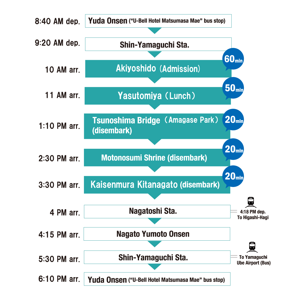 You can also choose your drop-off location in either Nagato City or Yamaguchi City, allowing flexible travel plans—such as continuing by JR train from Nagato City Station toward Hagi, or staying overnight at Nagato Yumoto Onsen to relax and enjoy the hot springs.