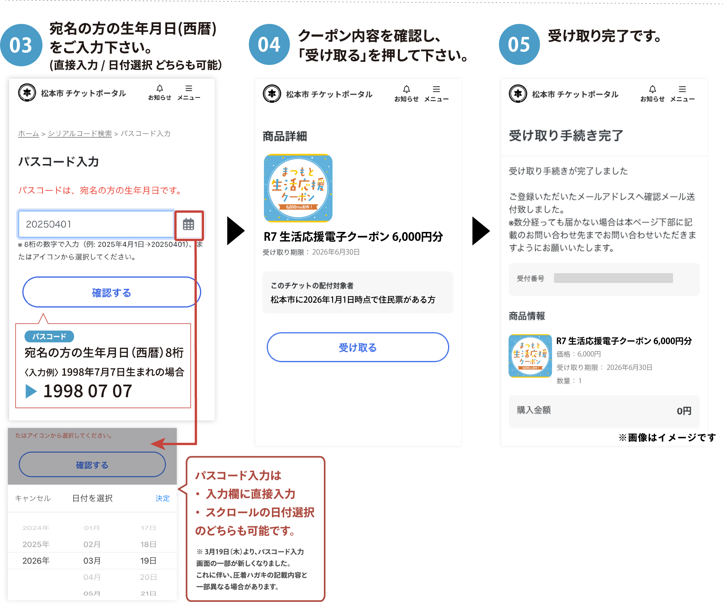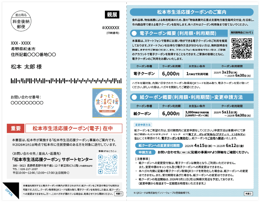 - 「松本市生活応援クーポンのご案内」クーポン配布の通知書は、2026年3月中旬頃(予定) に各ご家庭へ郵送にてご案内いたします。通知書が届かない場合は、4月10日(金)以降に、サポートセンター(TEL|026-217-1037)までお問い合わせください