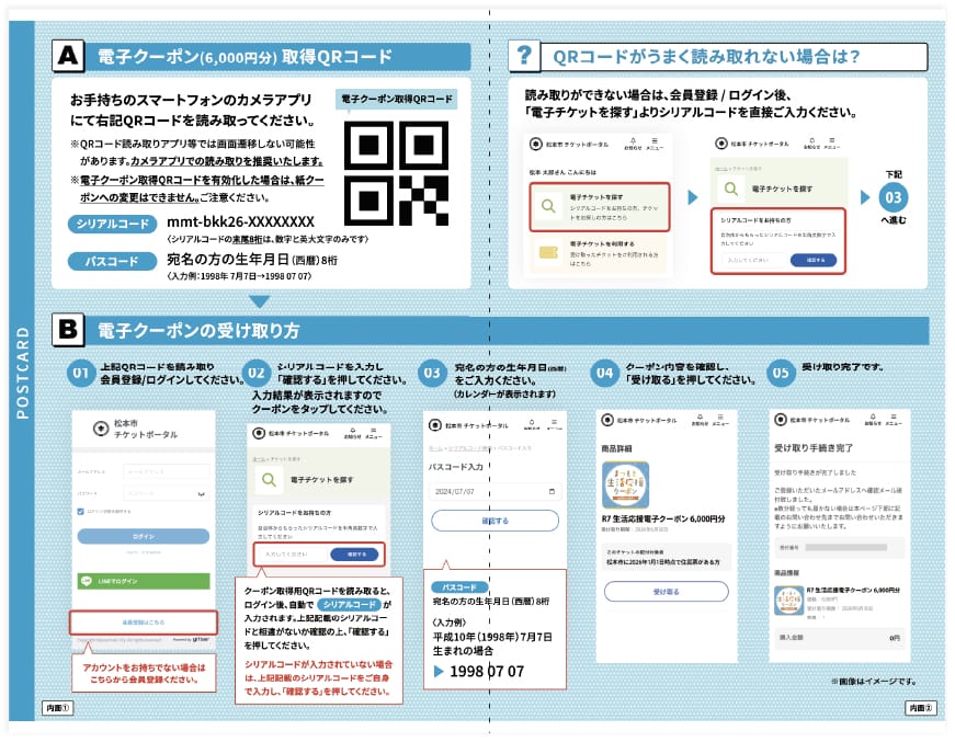 ご自宅に届いた「松本市生活応援クーポンのご案内」の圧着はがきを開封してください。