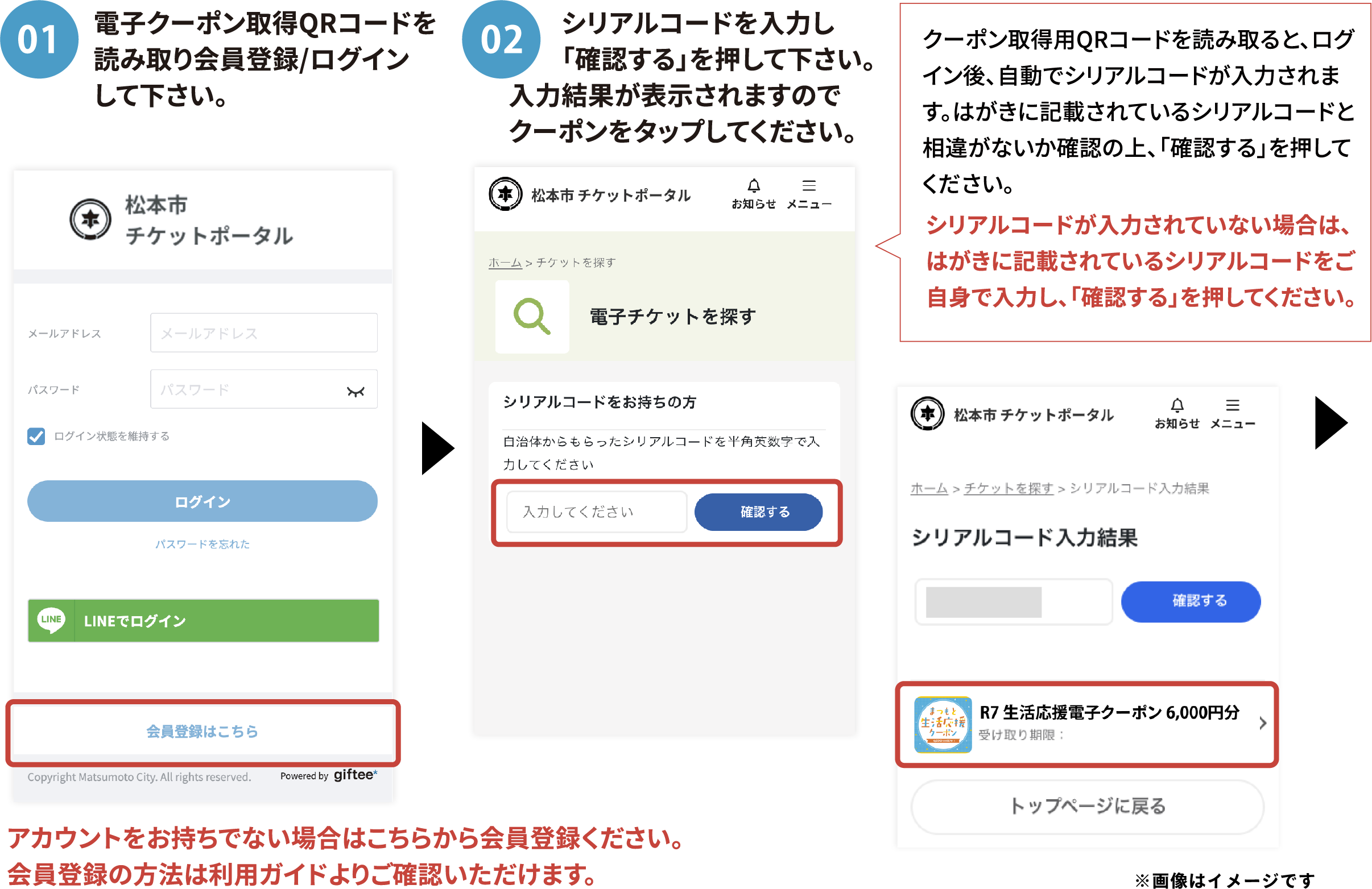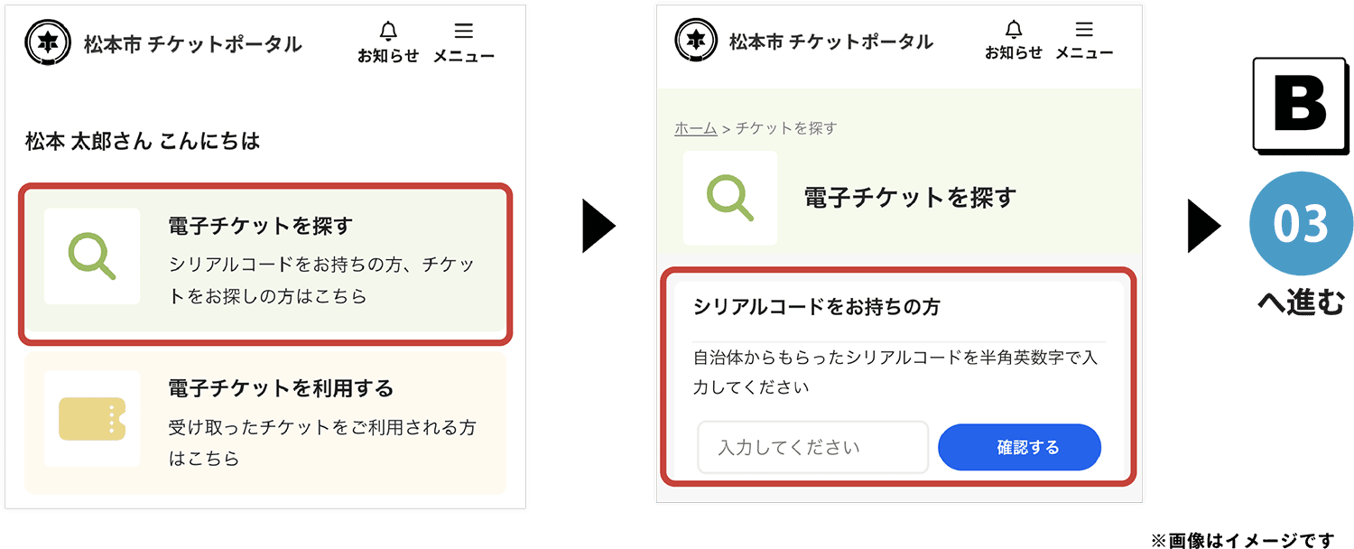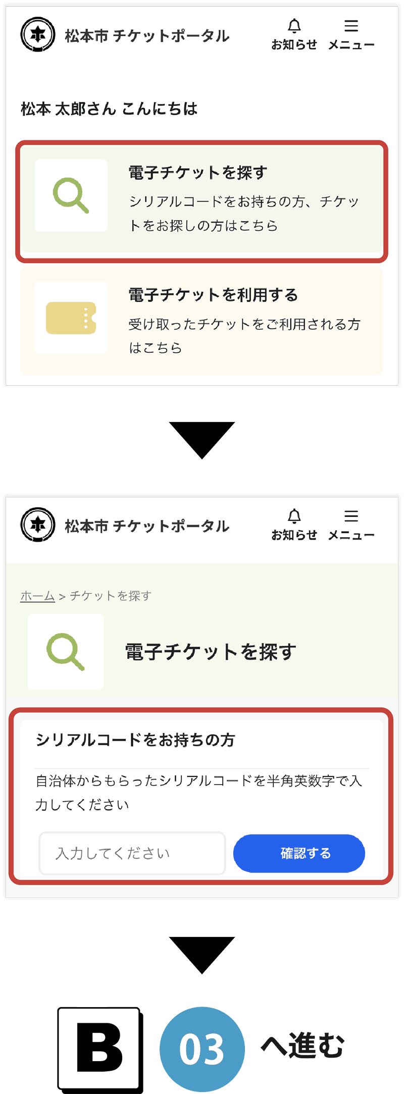 会員登録 / ログイン後、「電子チケットを探す」よりシリアルコードを直接ご入力ください。