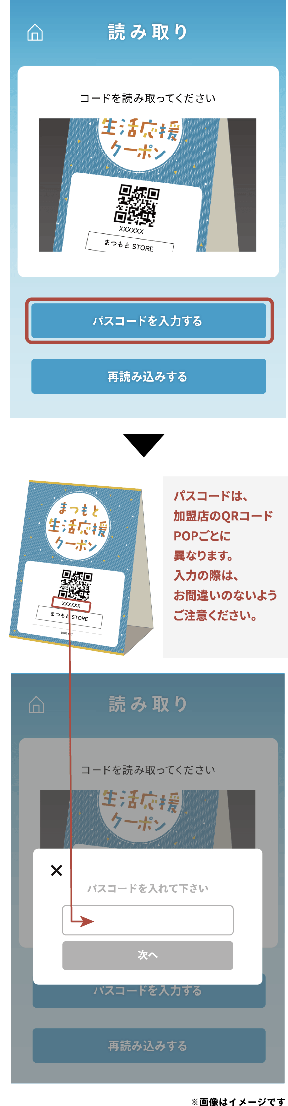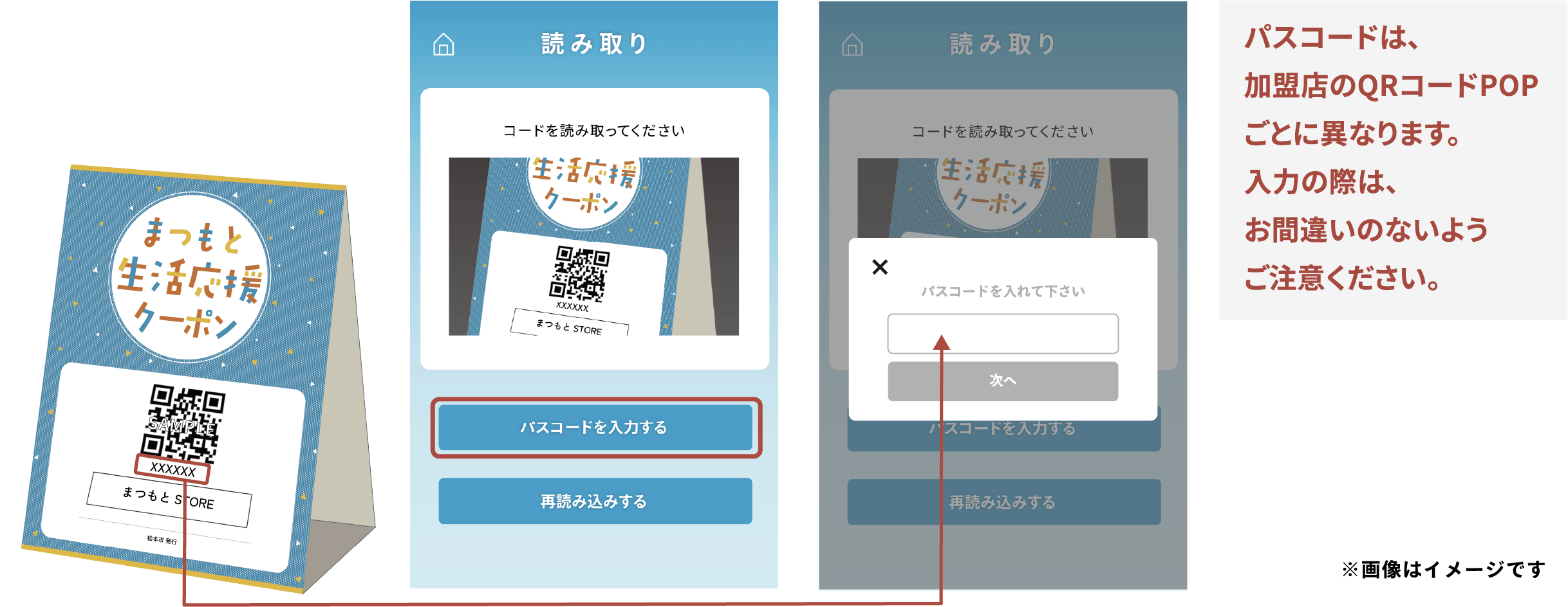 加盟店のQRコードPOPに記載されているパスコード(6桁 / QRコードの真下に記載)を画面に入力してください。